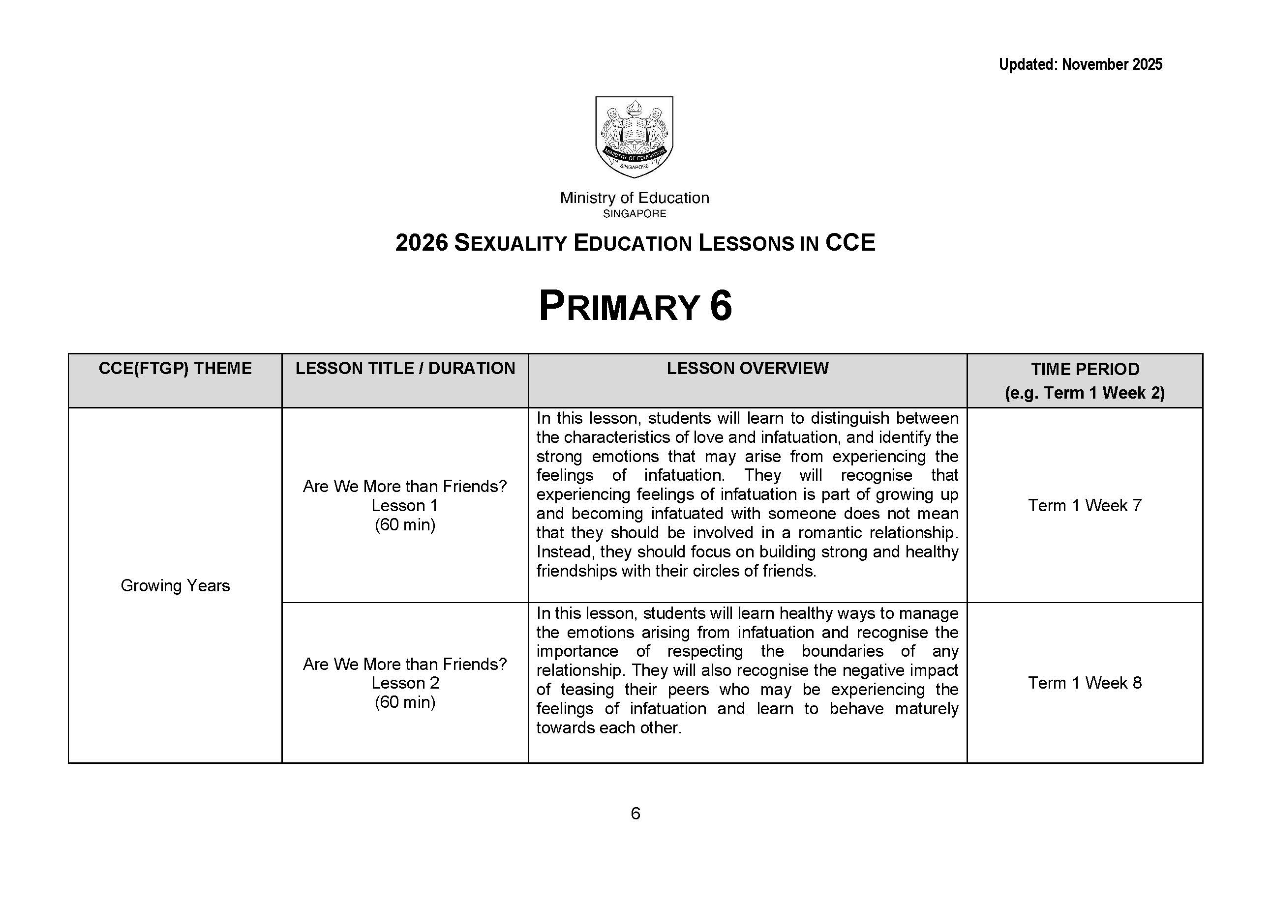 The upper primary years mark the onset of puberty. With better nutrition and improved health care, children are reaching puberty at a younger age and have to grapple with physical, emotional and psychological changes in themselves. The implication is that our children are becoming biologically ready for sexual activity sooner without necessarily having the corresponding cognitive or emotional maturity to modulate their behaviours. Furthermore, our young are also exposed to a wide range of influences that could endanger health and undermine the integrity of the family. Our students require close guidance so that they can respond with discernment to the sexual messages in the media and other sources.